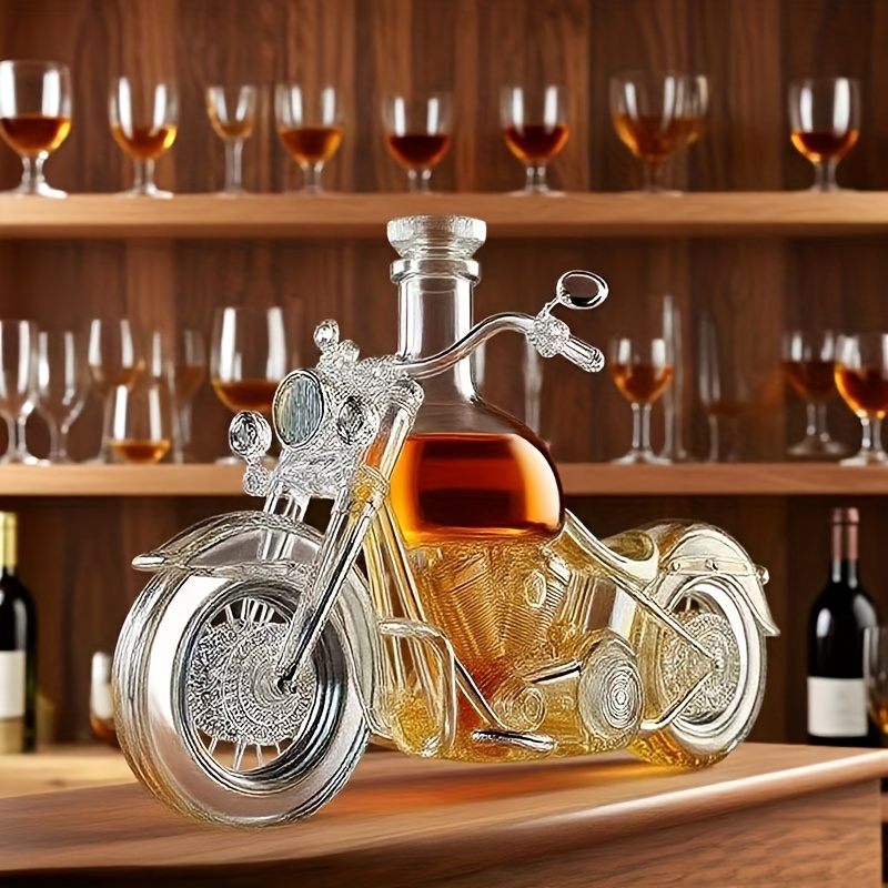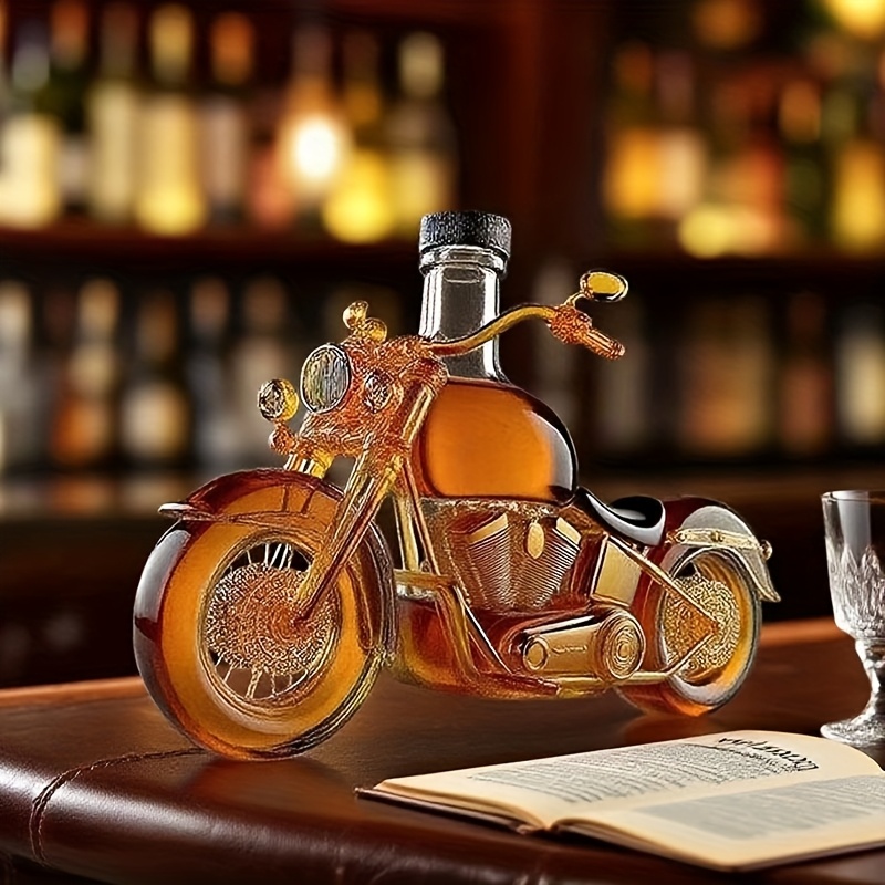 mootorratta kujuline karahvin – l realistliku disainiga, musta korgiga. Uudne kodubaari aksessuaar ja kingitus mootorrattahuvilistele. See unikaalne karahvin sobib suurepäraselt kodubaari sisustuseks.